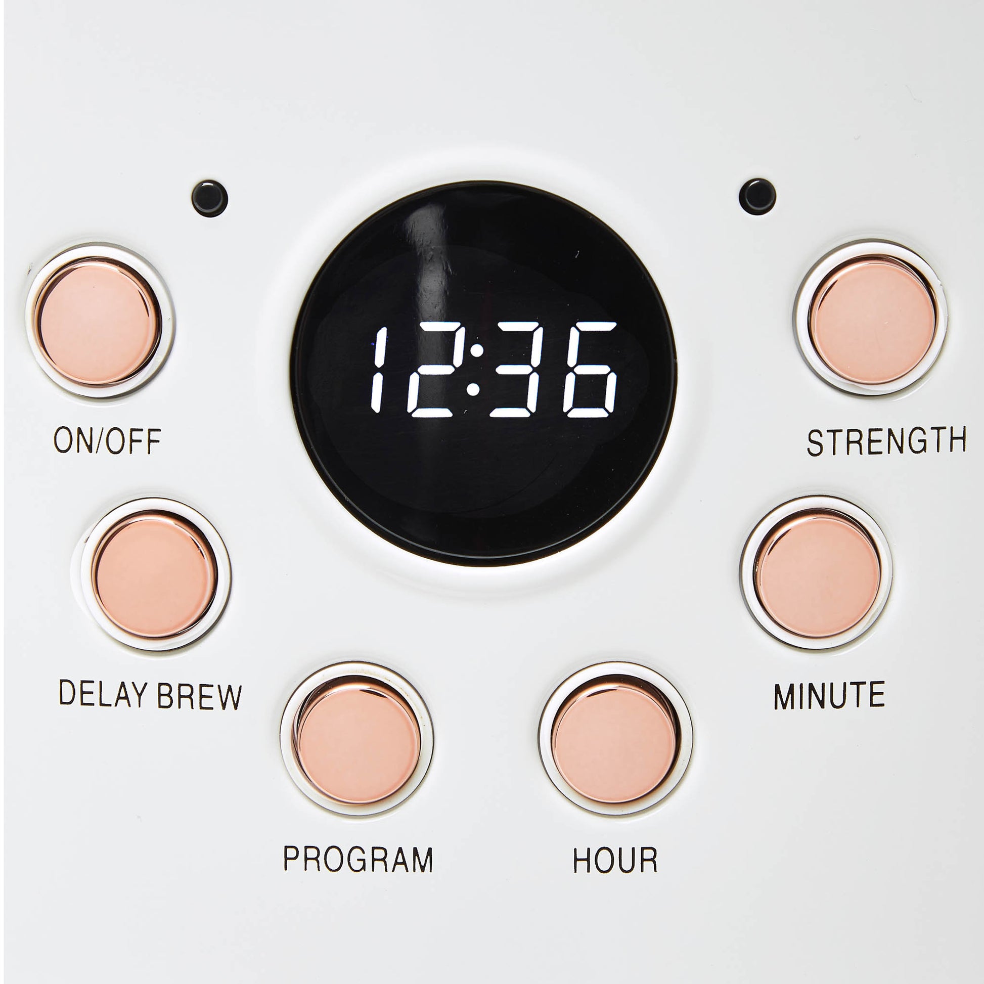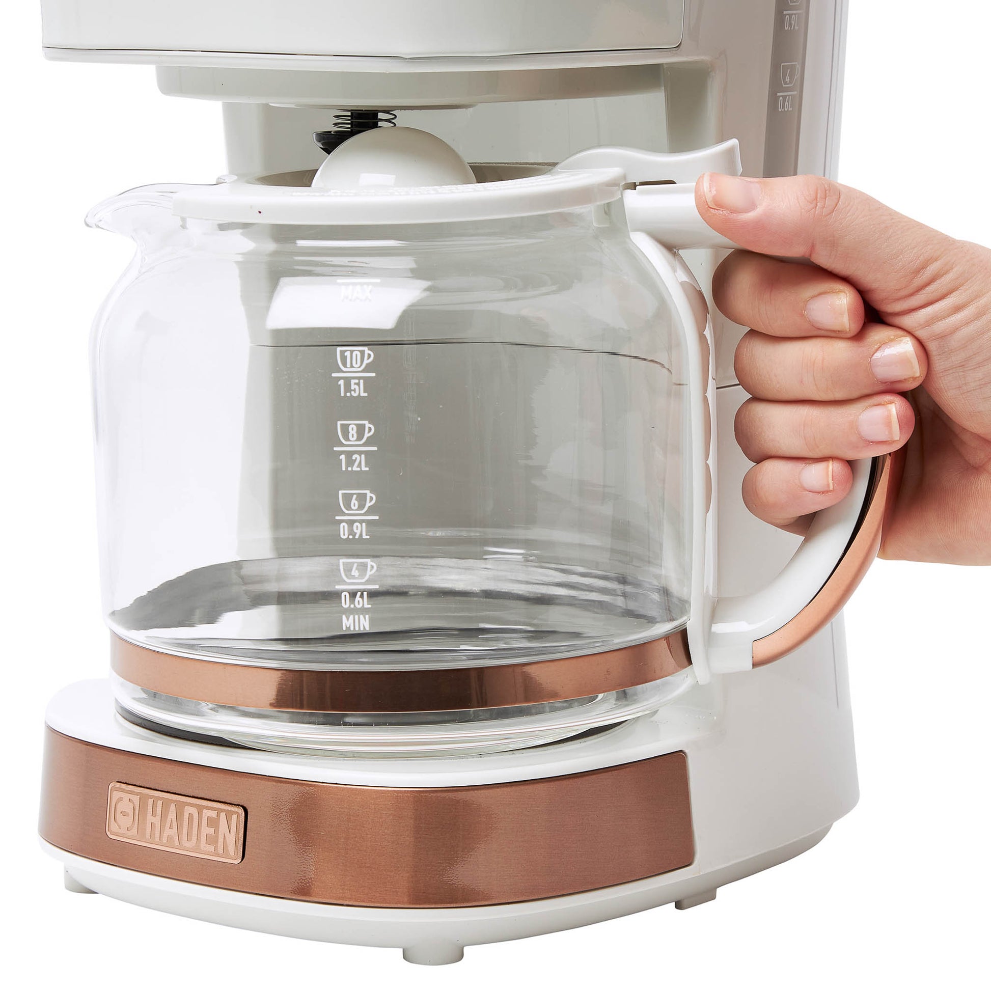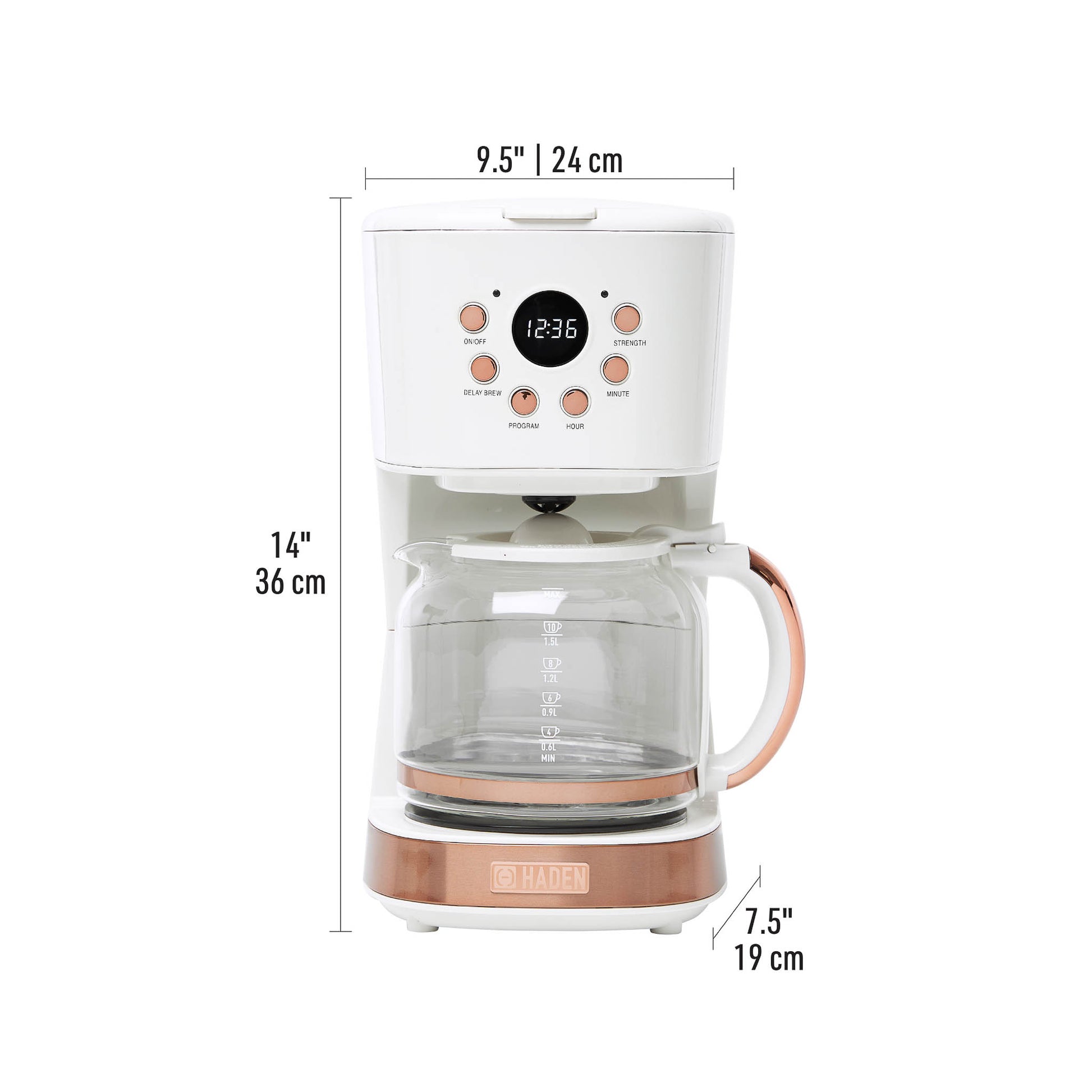 Produce the perfect cup of coffee with ease and style with the Haden Coffee Maker. The elegant color will add flair to any kitchen. This coffee maker has six functions: on/off, delay brew, program, hour, minute, and strength. It also has an LCD clock and a thirty-second anti-drip feature. This coffee machine also has a keep warm feature, so if one cup isn’t enough, you can pop back and pour yourself another cup. Shop the complete collection for more colors and products.