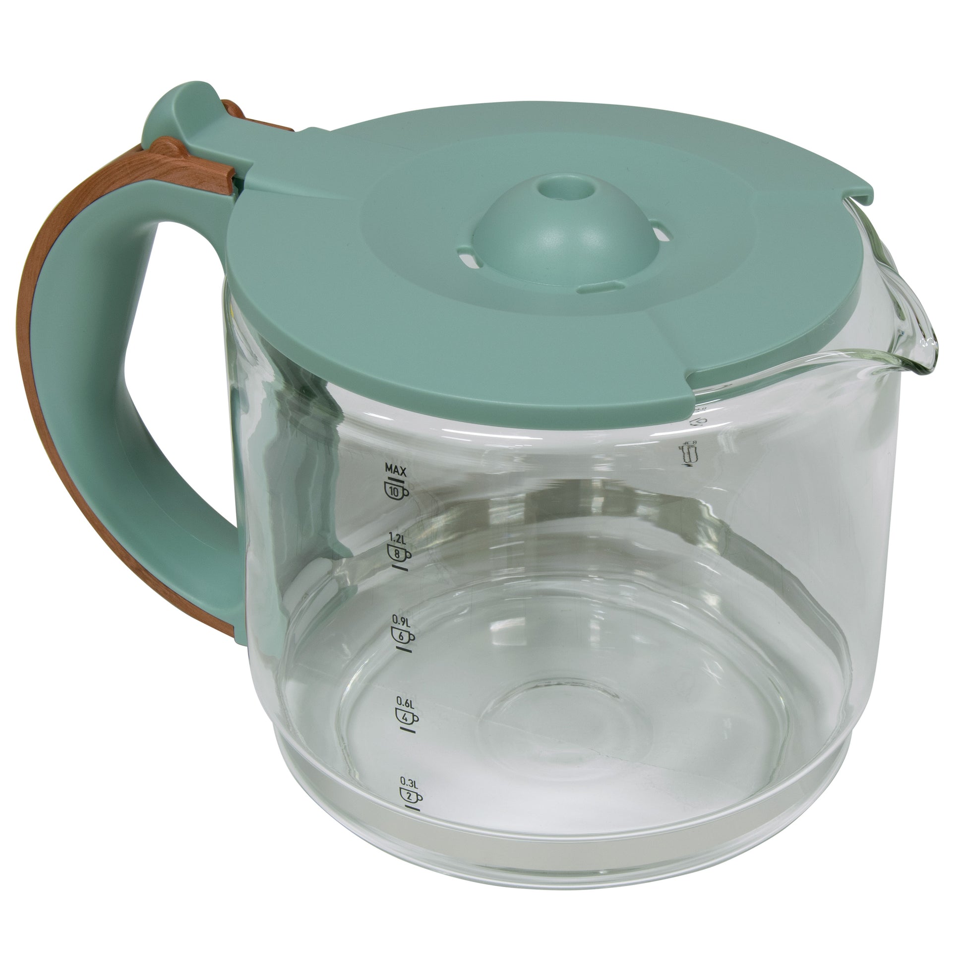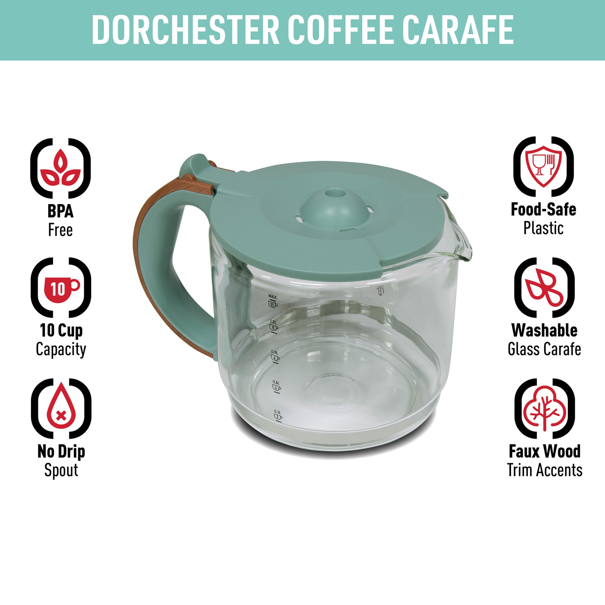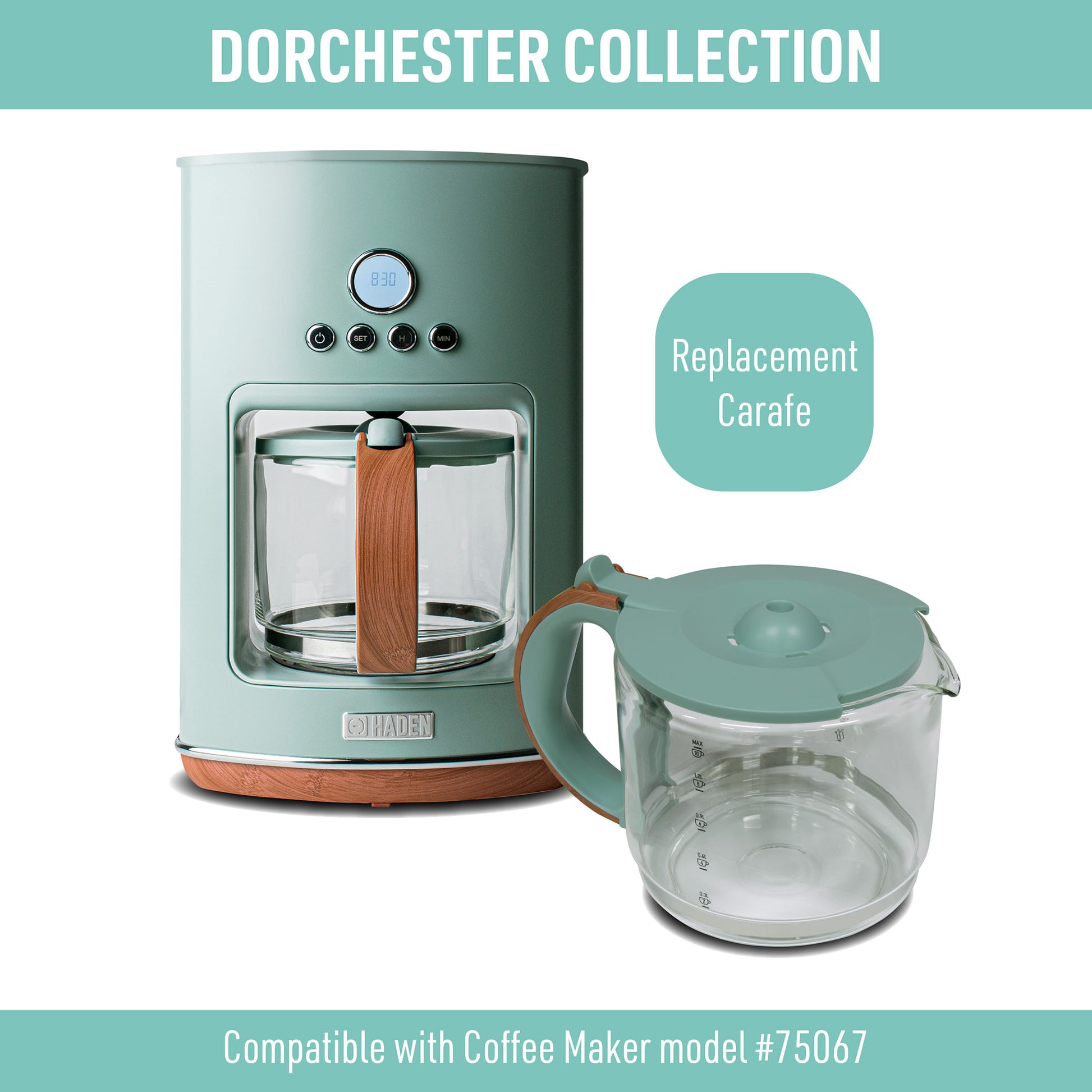Upgrade your coffee experience with the HADEN 10-Cup Replacement Glass Carafe Pot, designed specifically for the Dorchester Coffee Maker (Model #75067). This stylish carafe features a sleek glass body with a silt green handle and a unique faux bois trim accent, adding a touch of elegance to any kitchen. With a generous 2 to 10-cup capacity, it’s perfect for brewing coffee for yourself or a group. The extra-wide mouth lid ensures easy, spill-free pouring, making serving your coffee effortless. Plus, it’s easy to maintain – simply hand wash with soap and water for long-lasting durability. Enhance both the style and functionality of your coffee routine with this must-have carafe!