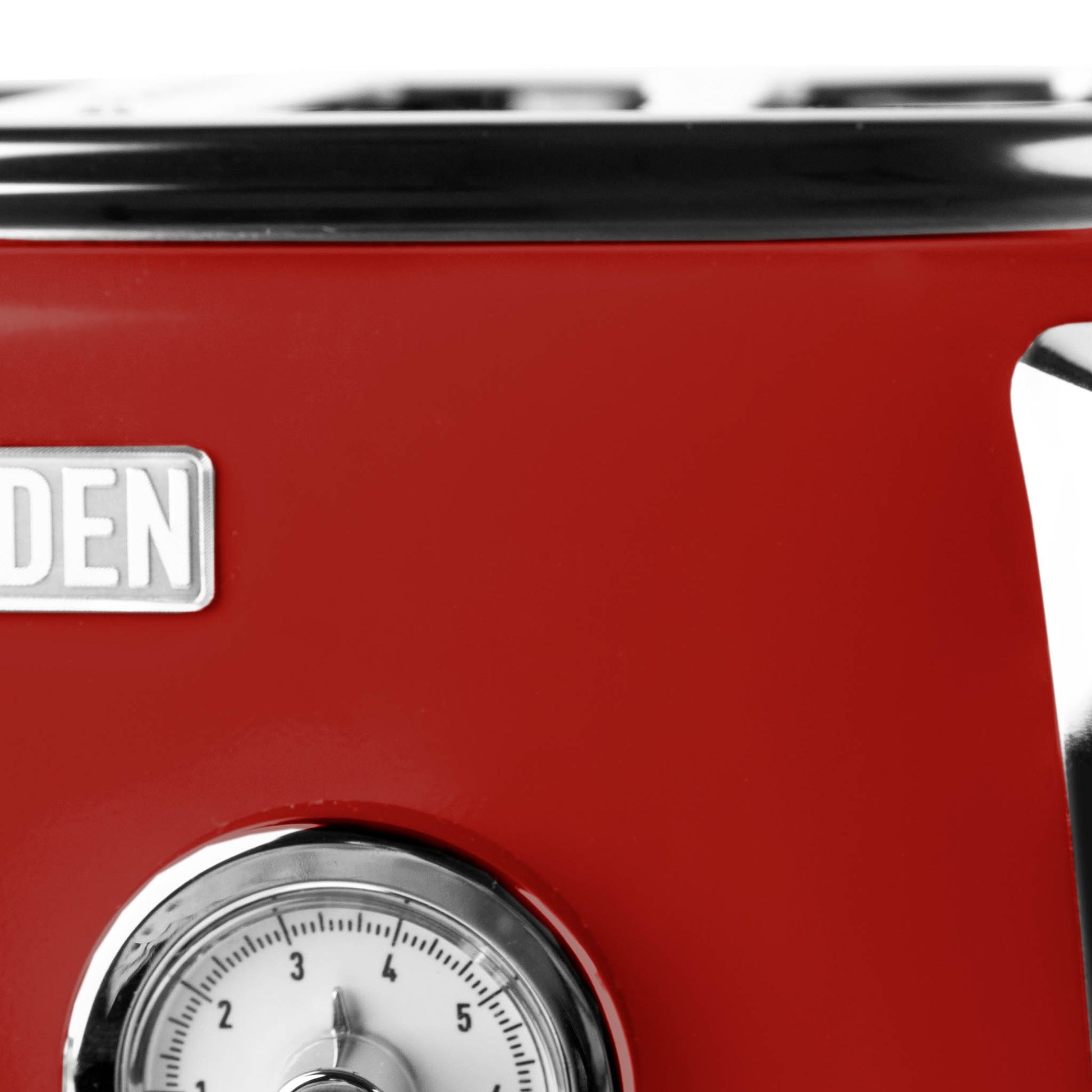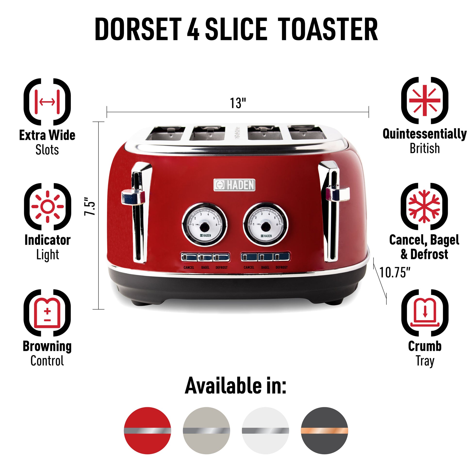 - Features: Four Slice Toaster with Extra Wide Slots for Bagels Painted Stainless Steel with Haden Badge, Painted Stainless Steel Housing with Haden Badge, Self-Centering Function, and Removable Crumb Tray