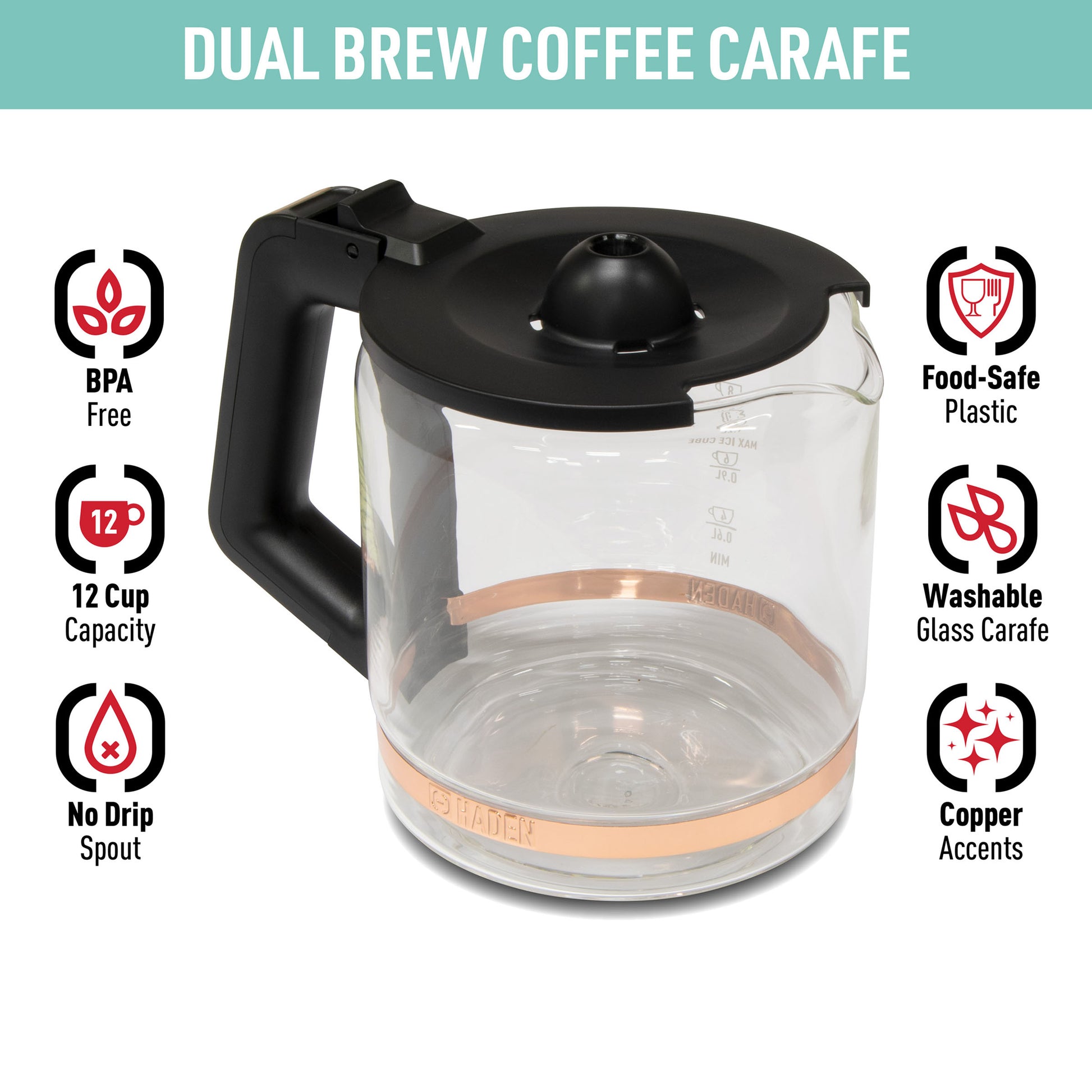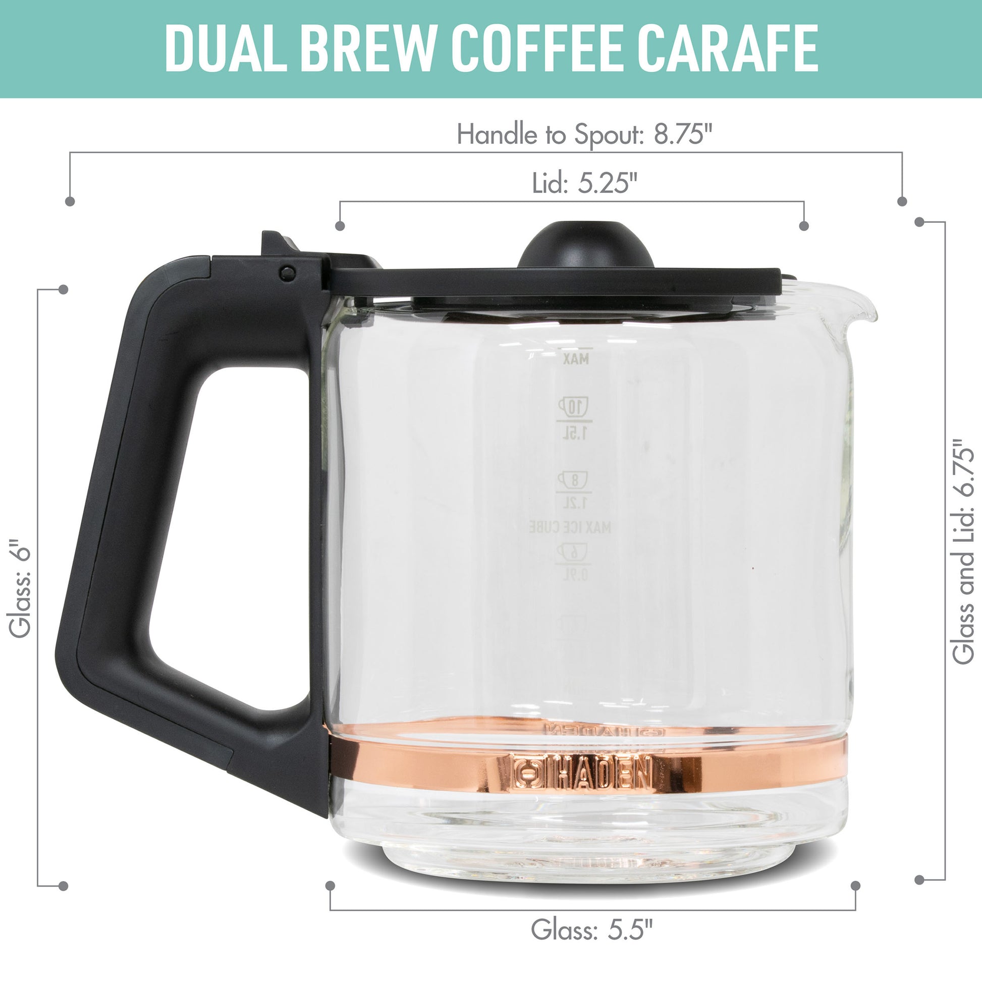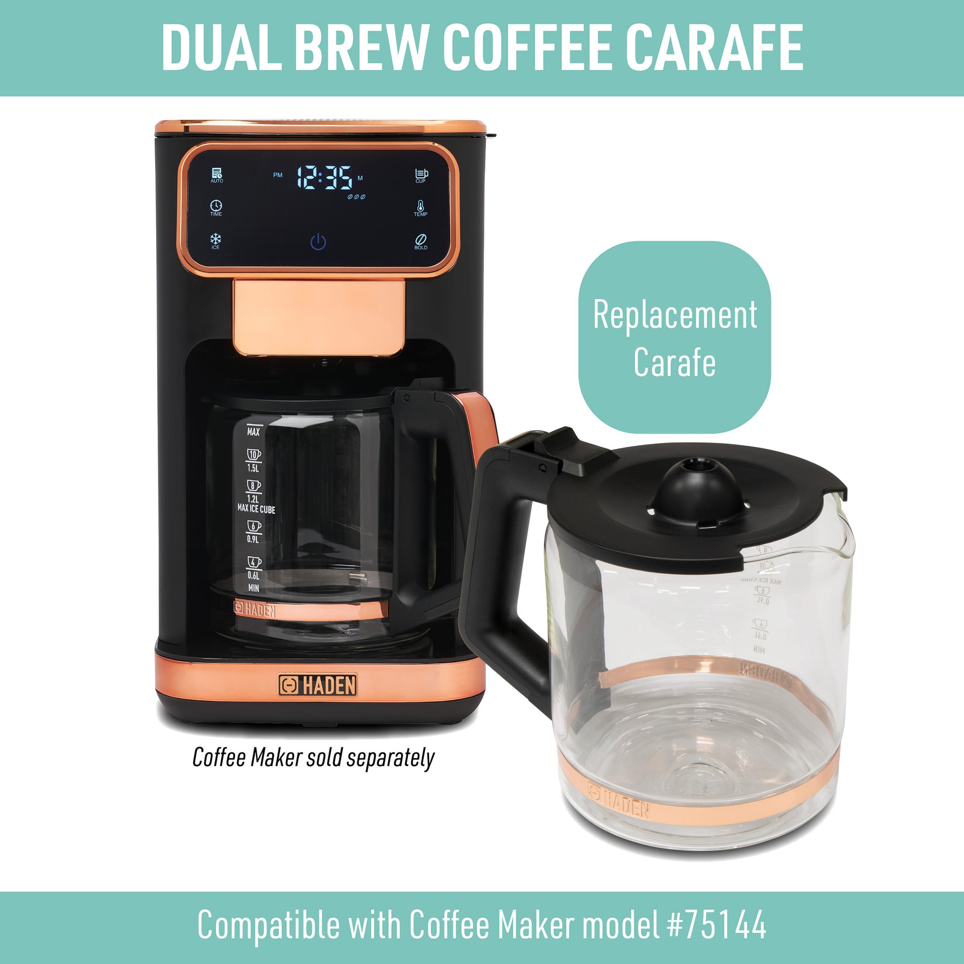 Upgrade your coffee experience with the HADEN 12-Cup Replacement Glass Carafe Pot, designed specifically for HADEN Dual Brew Coffee Maker Model #75144. This stylish carafe features a sleek glass body with a black handle and lid with copper trim accents, adding a touch of elegance to any kitchen. With a generous 12-cup capacity, it’s perfect for brewing coffee for yourself or a group. The wide mouth lid ensures easy, spill-free pouring, making serving your coffee effortless. Plus, it’s easy to maintain – simply hand wash with soap and water for long-lasting durability. Enhance both the style and functionality of your coffee routine with this must-have carafe!