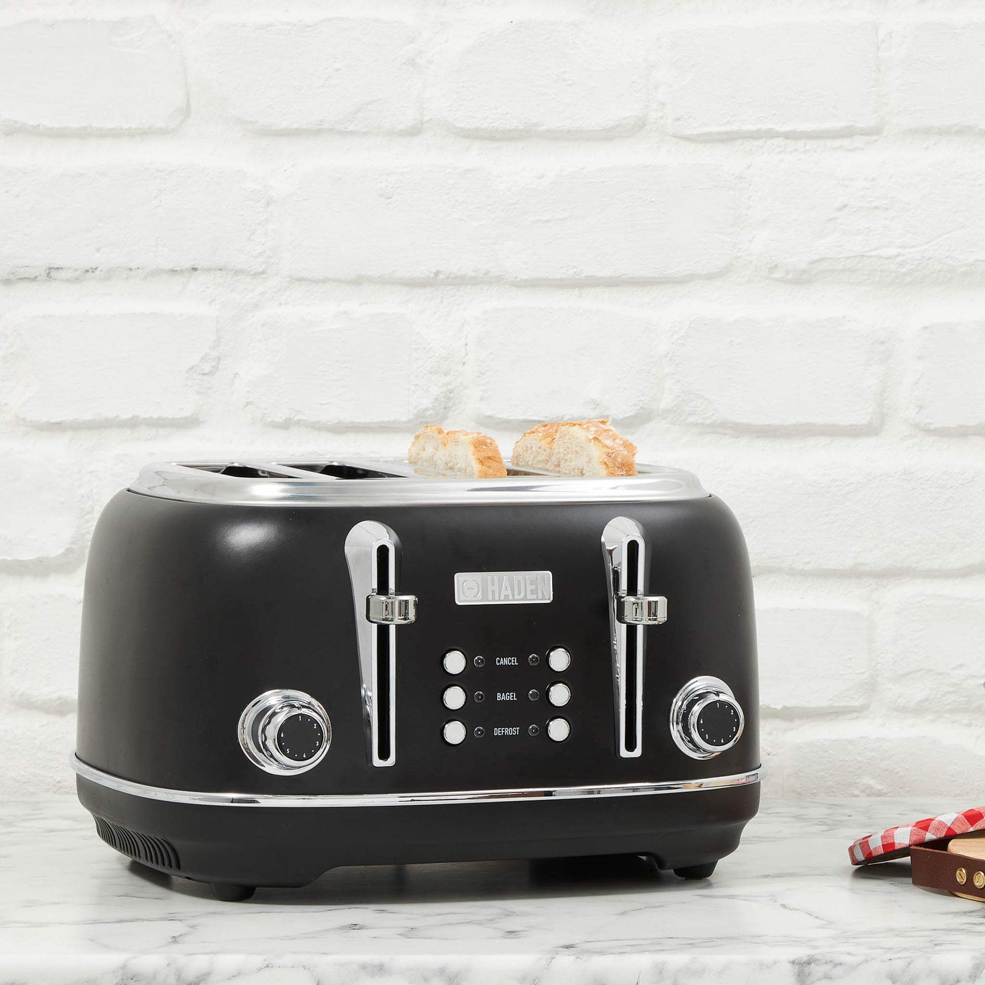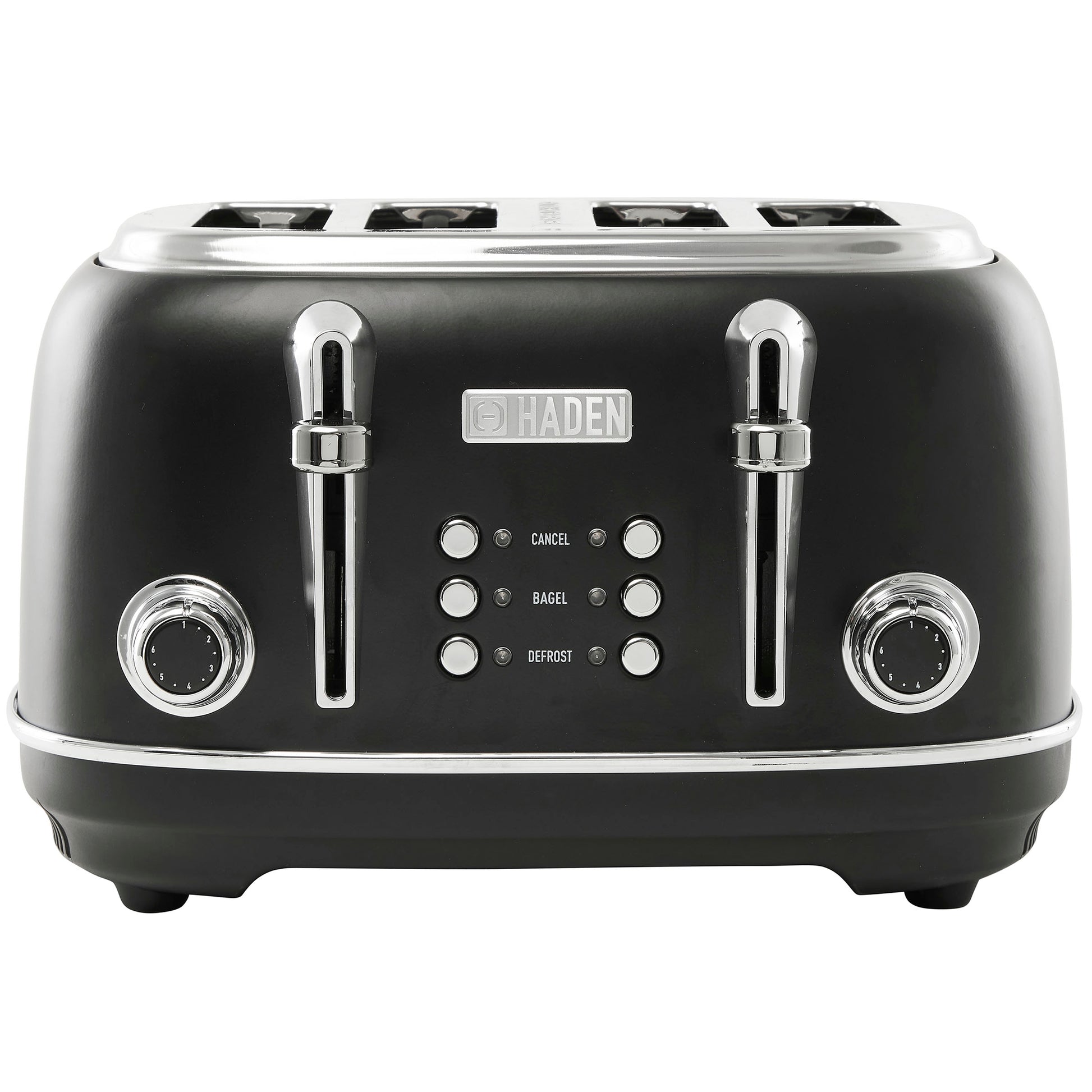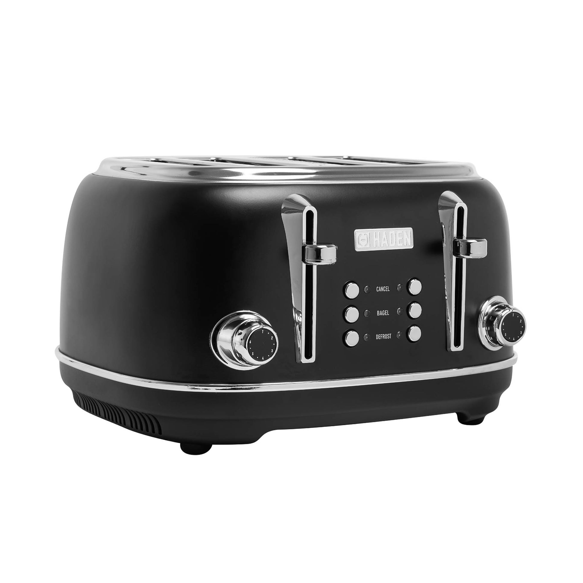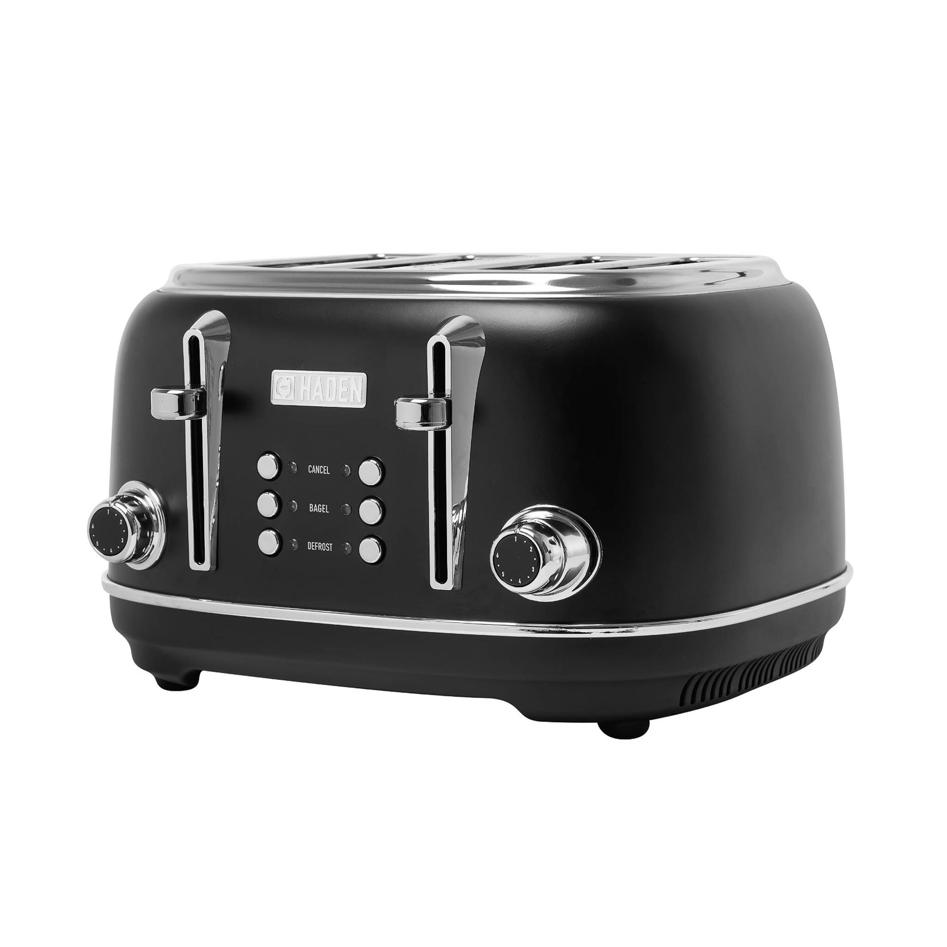 Brighten up your morning routine and upgrade your kitchen counter with the Haden Heritage 4–Slice Black & Chrome Toaster. This retro-chic product features multiple settings to ensure that your toasts or bagels are browned exactly to your liking, this product has a cancel setting that lets you stop the toasting cycle midway. A self-centering function automatically centers bread for a perfect result.