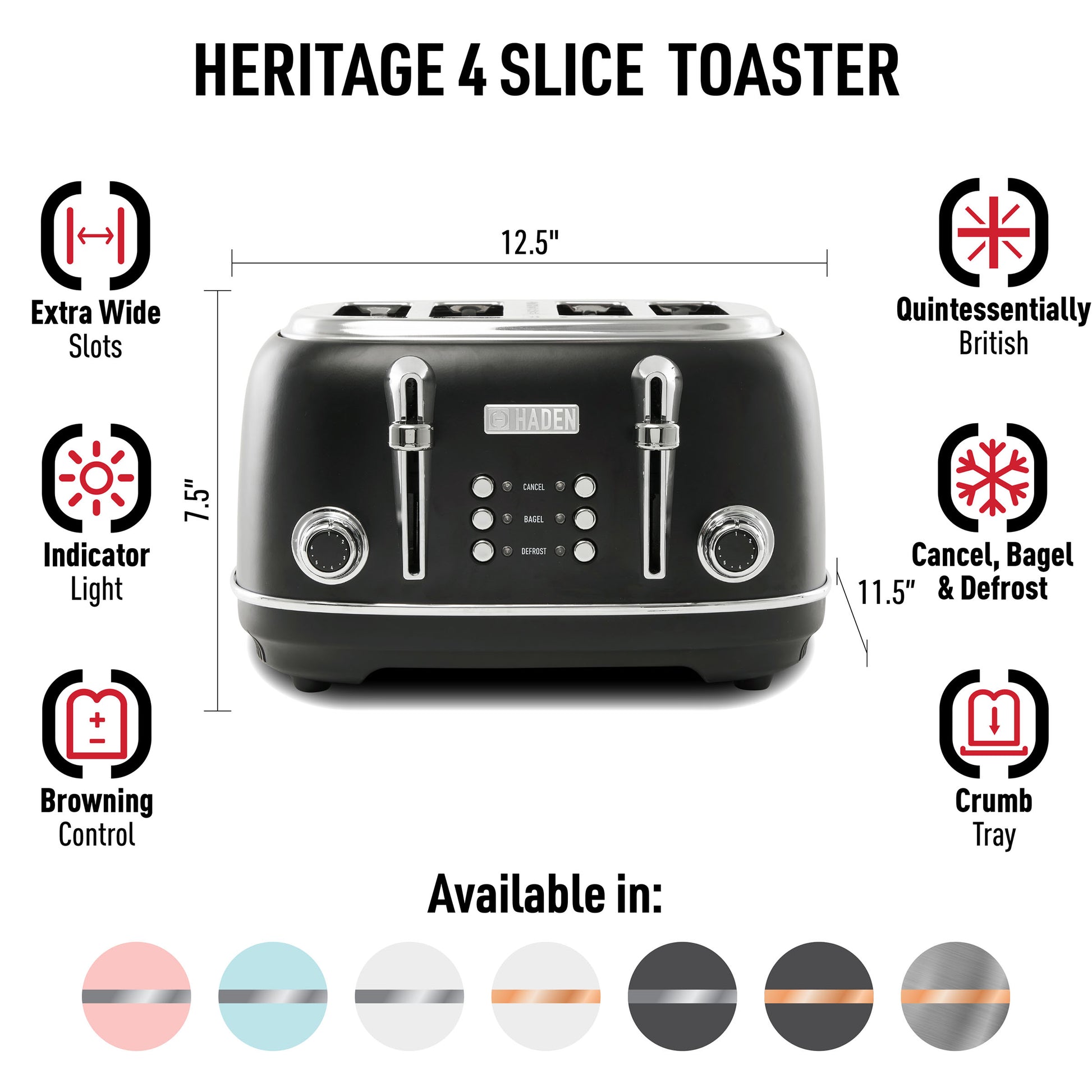 - Features: Four Slice Toaster with Extra Wide Slots for Bagels, Painted Stainless Steel Housing with Haden Badge, Self-Centering Function, and Removable Crumb Tray