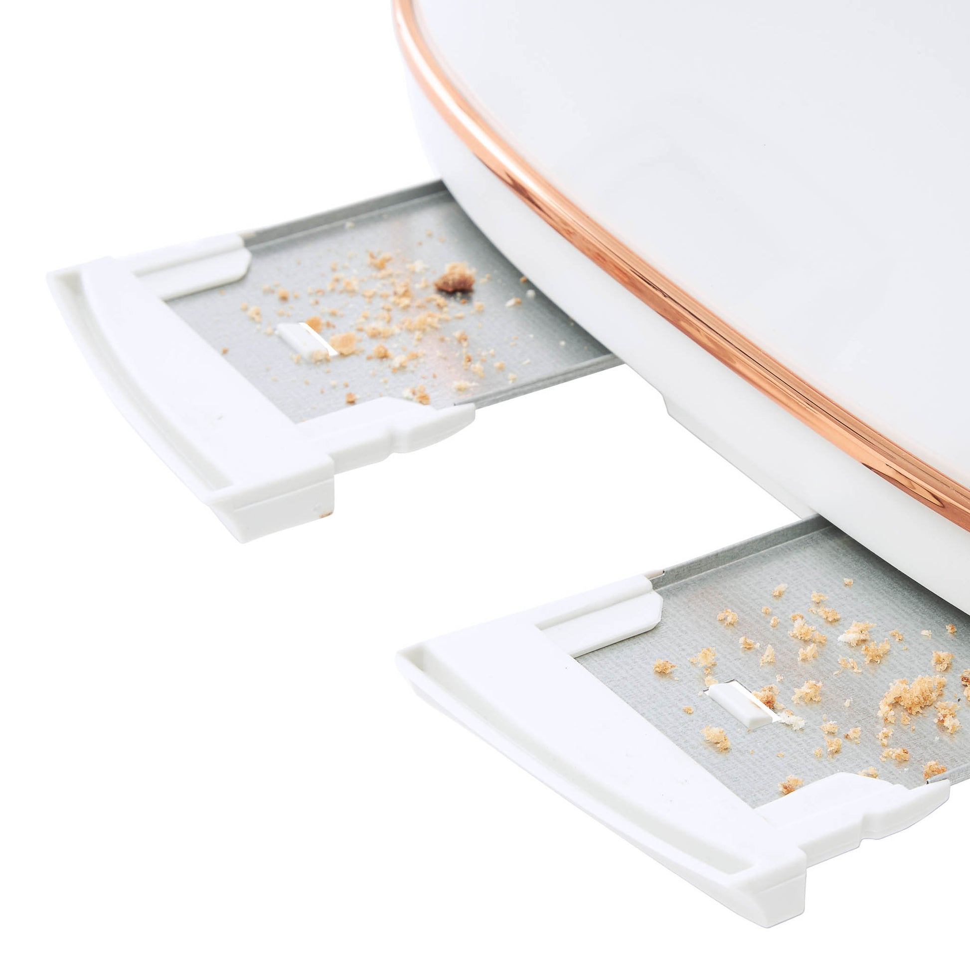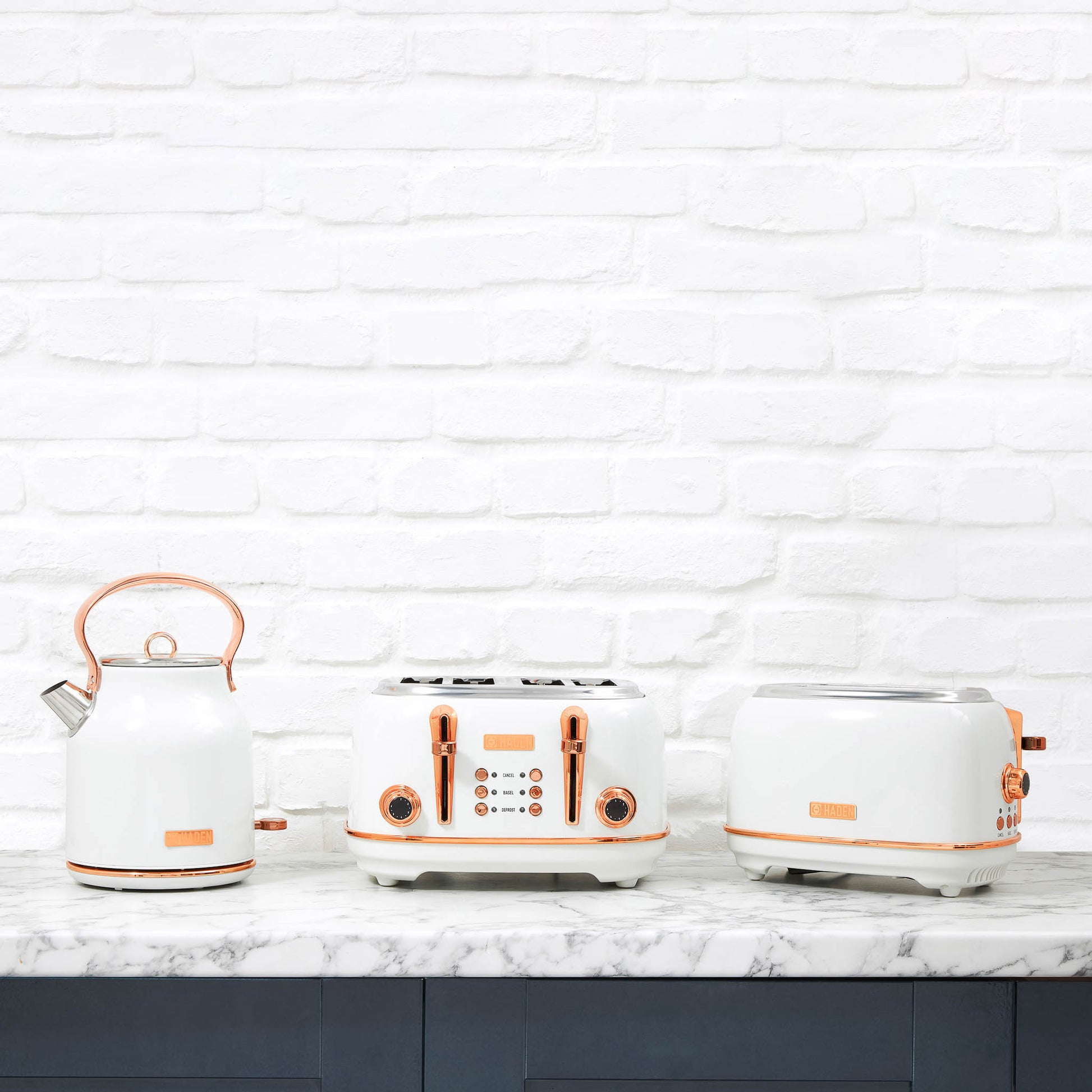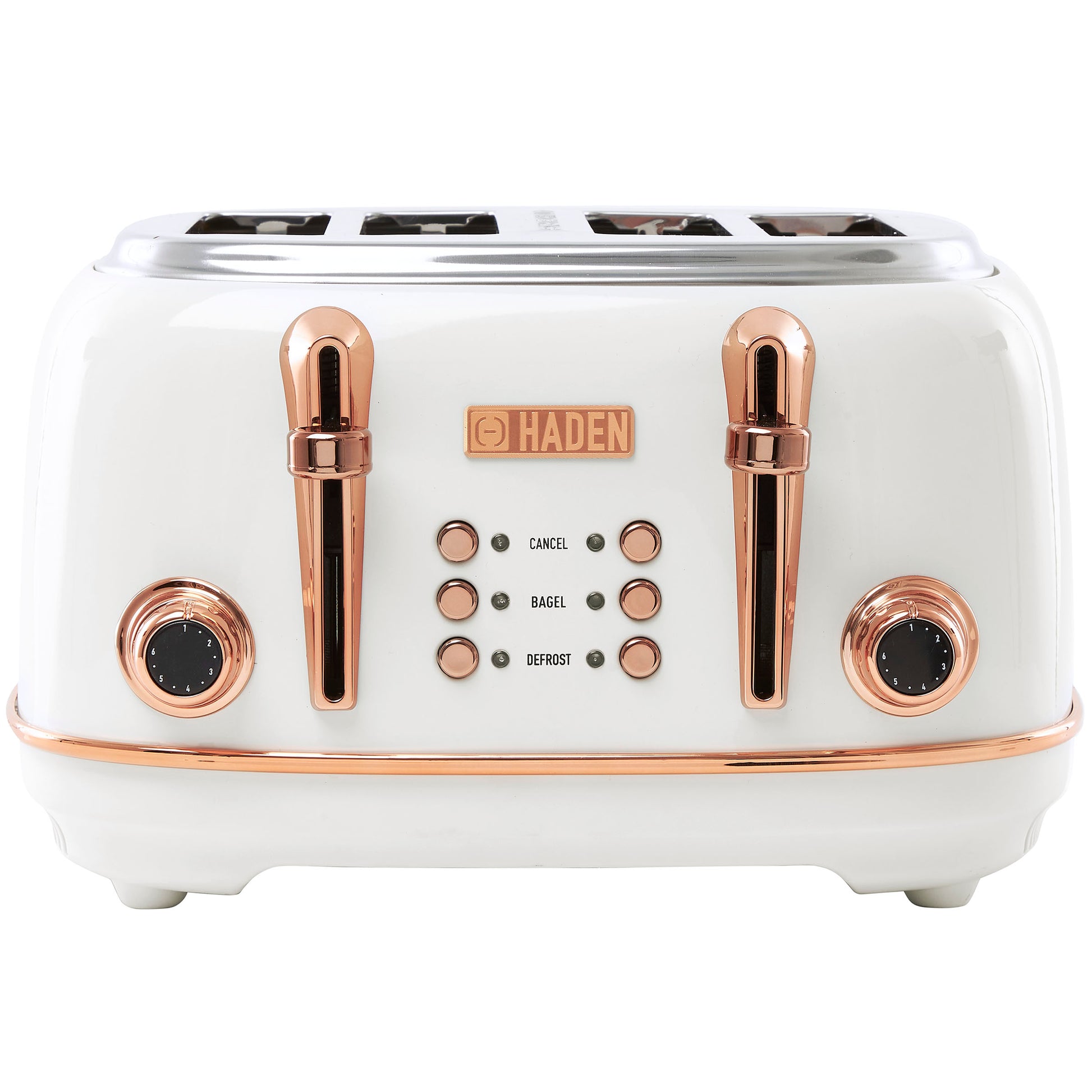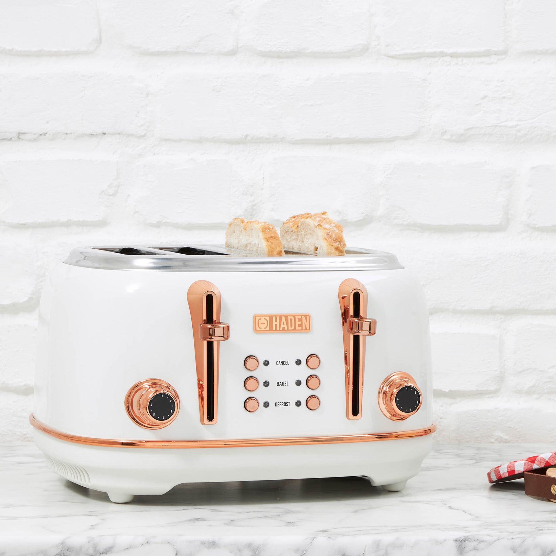 Brighten up your morning routine and upgrade your kitchen counter with the Haden Heritage 4–Slice Ivory & Copper Toaster. This retro-chic product features multiple settings to ensure that your toasts or bagels are browned exactly to your liking, this product has a cancel setting that lets you stop the toasting cycle midway. A self-centering function automatically centers bread for a perfect result.