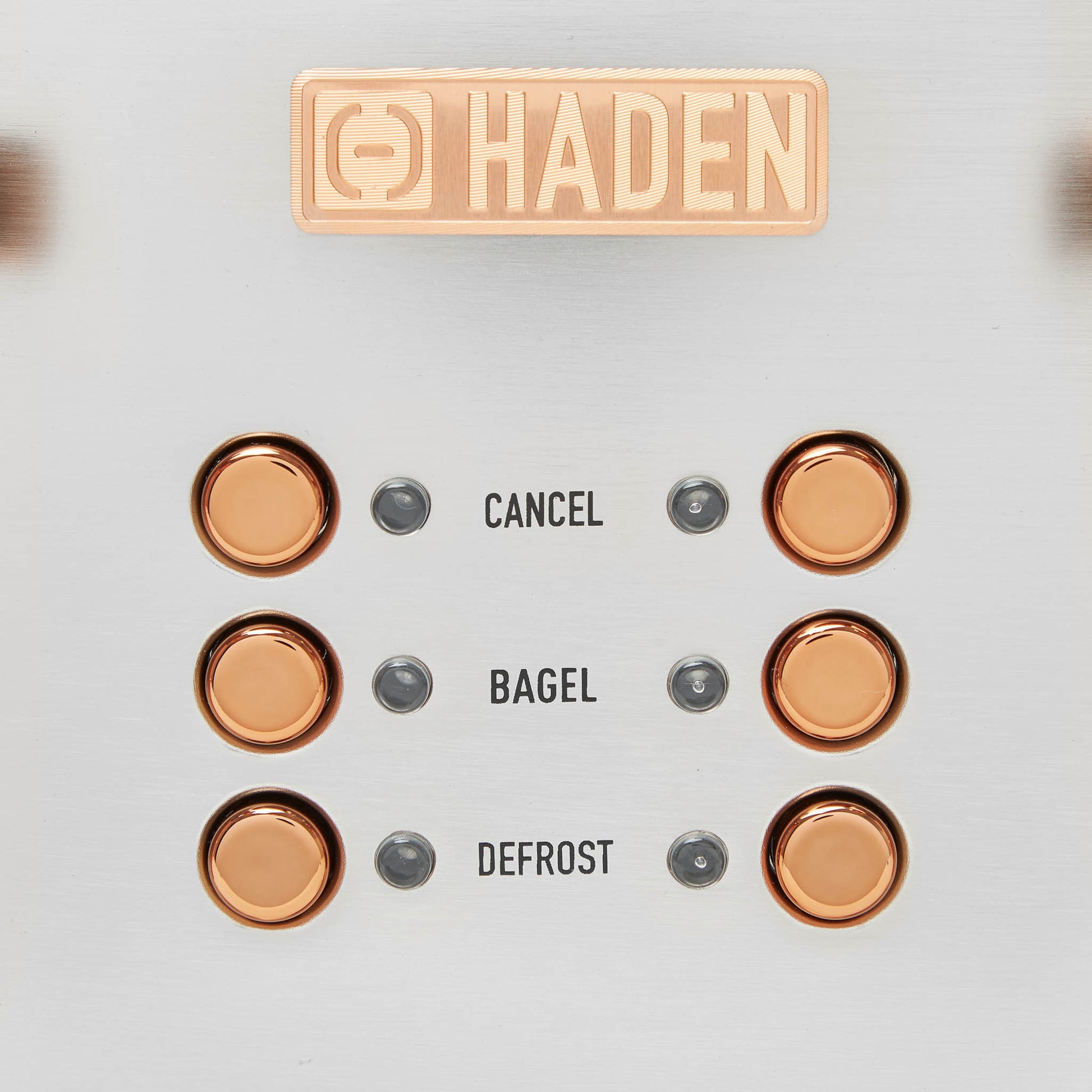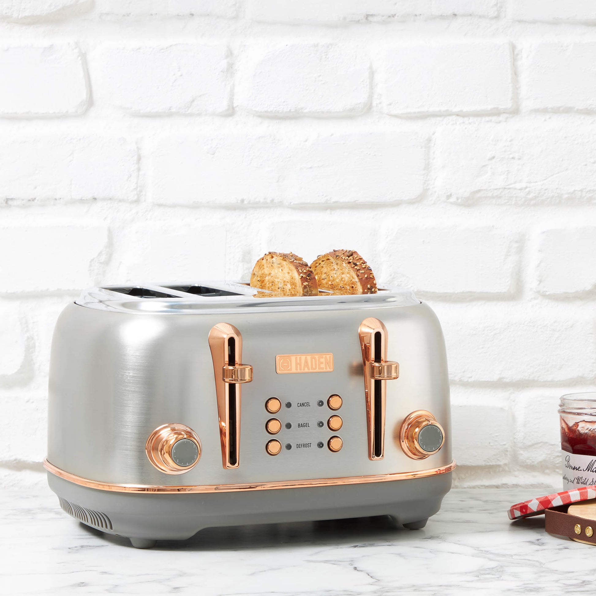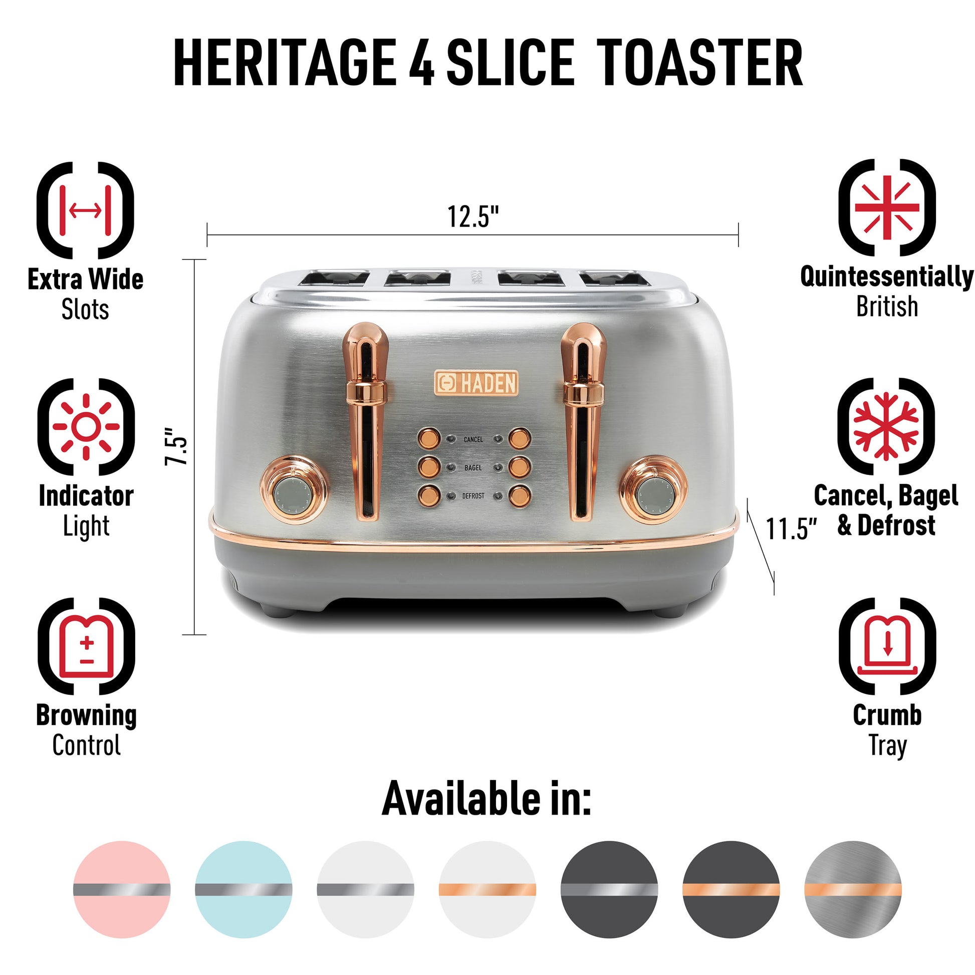 - Features: Four Slice Toaster with Extra Wide Slots for Bagels, Painted Stainless Steel Housing with Haden Badge, Self-Centering Function, and Removable Crumb Tray